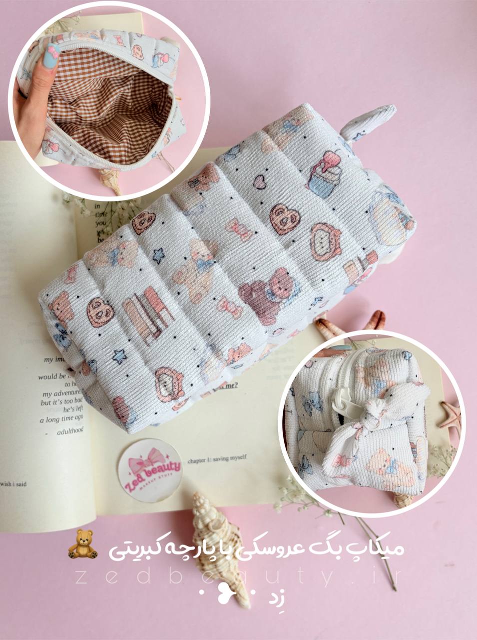 کیف لوازم آرایشی عروسکی خرسی با پارچه کبریتی جادار و سبک